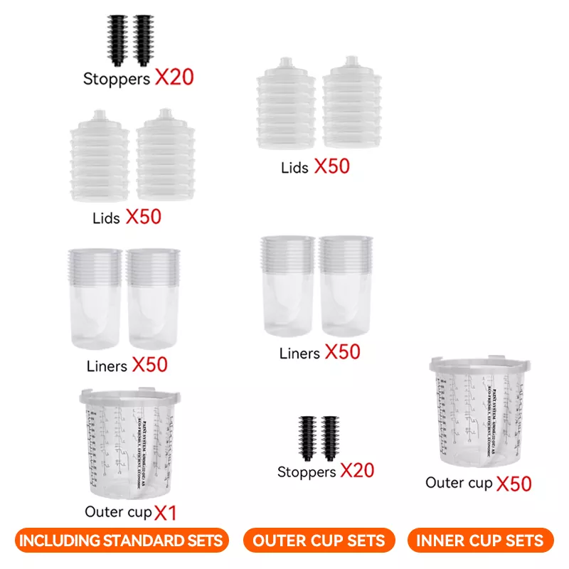 표준 세트, 외부 컵 세트 및 내부 컵 세트를 포함한 다양한 스프레이 컵 시스템 세트를 제공합니다.
