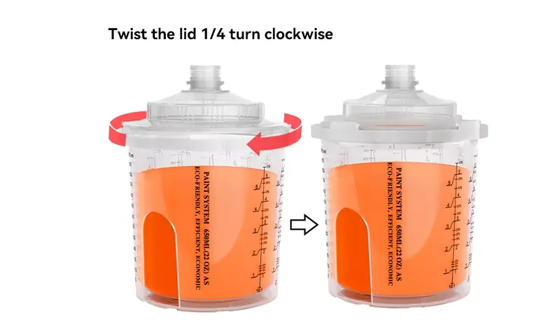 시스템을 잠금 해제 할 때 먼저 건을 바닥으로 누르고 어댑터가 자유 롭을 때까지 시계 반대 방향으로 돌리십시오. 둘째, 뚜껑이 외부 컵의 자물쇠가 완전히 없어 질 때까지 계속 회전 한 다음 스프레이 건을 분리하십시오.