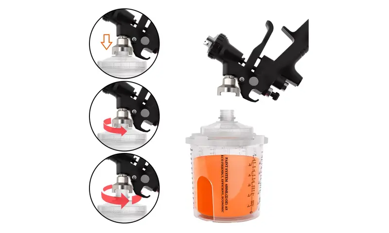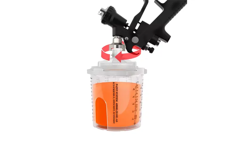 스프레이 건을 부착하고 스프레이 건 컵을 제자리에 잠그십시오.