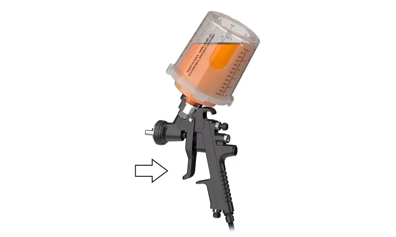 에어 호스를 연결하고 방아쇠를 눌러 일회용 스프레이 건 컵에서 공기를 제거하십시오.