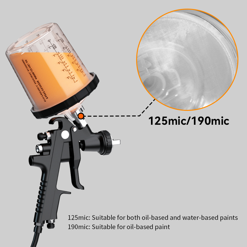 • 우수한 페인트 마감을 위한 내장형 통합 필터: 일회용 스프레이 컵 캡에는 190μ(유성 페인트) 및 125μ(수성 페인트) 필터가 내장되어 있어 스프레이 중에 불순물을 효과적으로 필터링하고 페인트 광택을 20% 증가시킵니다.
